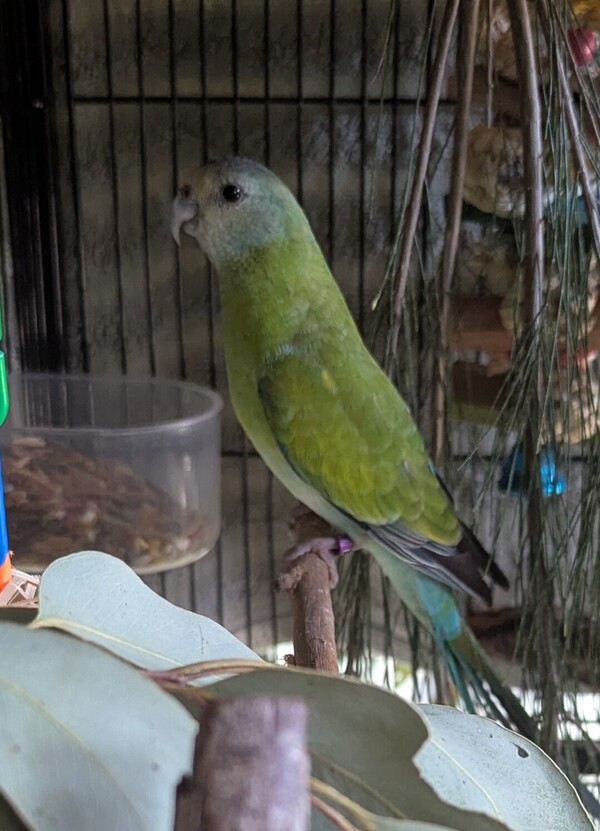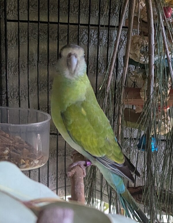 Nibbles is a Hooded Parrot who is still gaining confidence with handling and will need a patient, dedicated adopter to continue gentle socialisation and trust‑building.