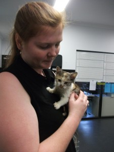 Gemma had substantial facial injuries; her left eye was swollen and there was a deep cut running from her mouth to her nose. Our Nurse immediately gave Gemma some analgesia to relief the kitten of any discomfort, then bathed the tiny kitten to remove all the fleas. Warm and dry, Gemma was placed in an intensive care pen. These pens can be warmed and are in full view so that the Nurses can keep a close eye on the patients.