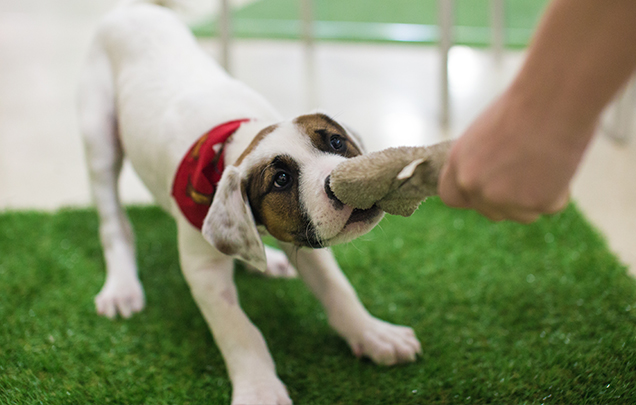 Grab out a rope toy get tugging! Tug of war is not only super fun for your pup, but it also lets them release frustration and allows them to set a goal - to win tug of war. Tug of war is a game to teach impulse control and a relationship building game with your dog. Practice teaching the dog to “give” on cue and trade the tug toy for a treat. If your dog can release the tug on cue, it makes the game way more fun and helps your dog learn impulse control at the same time. You can purchase a TONKA Mighty Chomp Rope Dog Toy at World For Pets.