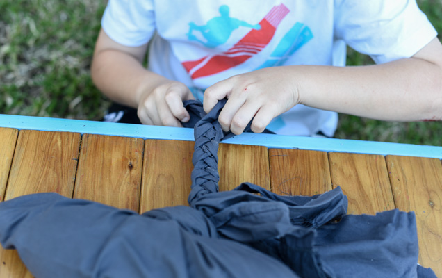 2. For some extra flair, cut a strand of three to make a braid that can either hang loose or can be wrapped around the bottle. This will be great for your dog to pull and tug!
