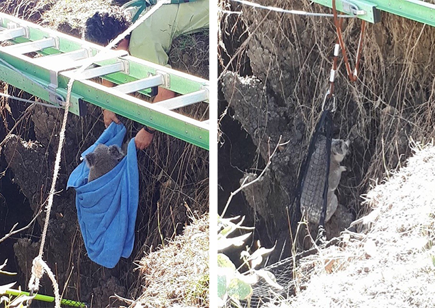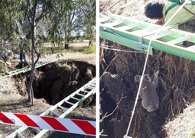 RSPCA Queensland and Queensland Fire and Emergency Services coordinated an unusual rescue of a dog and koala who fell into a 30-foot-deep abandoned mine shaft at Rosewood, near Ipswich.